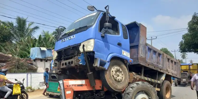 டிப்பர் வாகனம் தனது இயந்திரத்தின் மீது ஏறுவதைக் கண்ட உழவு இயந்திர