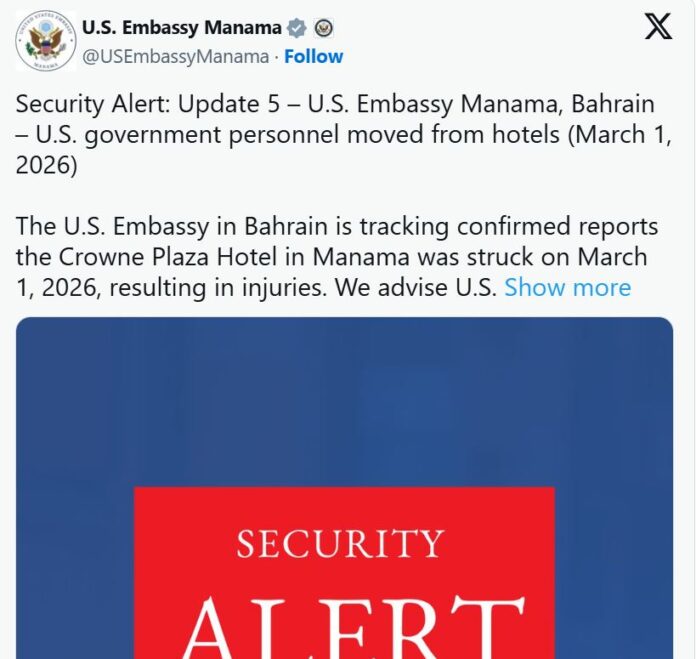 உள்ள அமெரிக்க தூதரகம் இன்று மனாமாவில் உள்ள கிரவுன் பிளாசா ஹோட்டல்